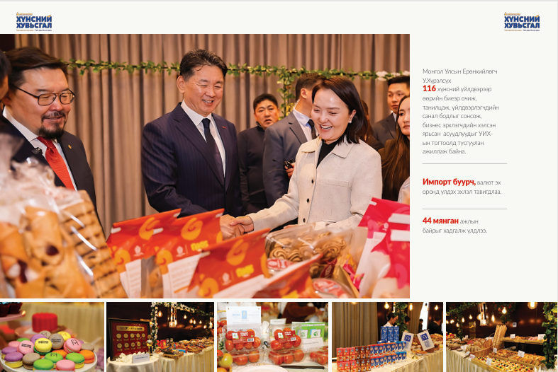 2025 оны арванхоёрдугаар сарын 12-нд буюу Дэлхийн хүнсний салбарын ажилтнуудын өдөр Засгийн газар болон үндэсний “Хүнсний хувьсгал”-д нэгдсэн ААН, үндэсний үйлдвэрлэгчид Монгол Улсын Ерөнхийлөгч У.Хүрэлсүхэд 3.5 жилийн ажлын үр дүнгээ танилцуулж, монголчууд нэгдэж нийлж ажлыг, хүнсийг дотооддоо хийж чаддаг гэдгээ харуулсан юм.